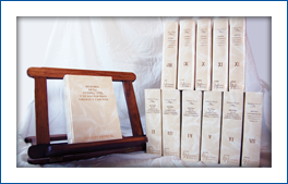 12 volúmenes en edición facsímil. Más de 8.000 páginas de 23,5 x 16,5 cm. Encuadernación color marfil con estampaciones en oro.